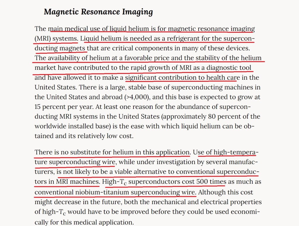 “The main medical use of liquid helium is for magnetic resonance imaging (MRI) systems. Liquid helium is needed as a refrigerant for the superconducting magnets that are critical components in many of these devices. The availability of helium at a favorable price and the stability of the helium market have contributed to the rapid growth of MRI as a diagnostic tool and have allowed it to make a significant contribution to health care in the United States.”