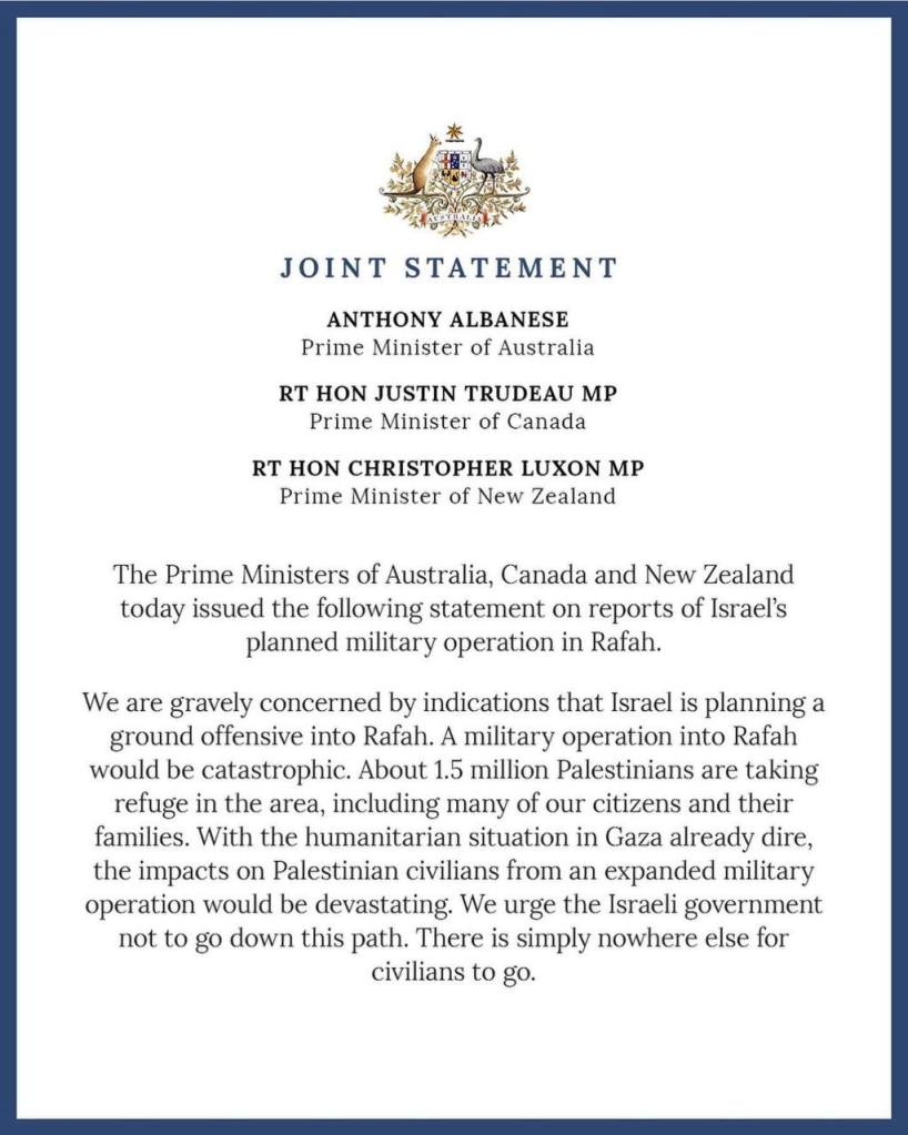 (Reuters) – The leaders of Canada, Australia and New Zealand on Thursday called for an immediate humanitarian ceasefire in Gaza, according to a joint statement released in response to reports about Israel’s planned military operation in Rafah.