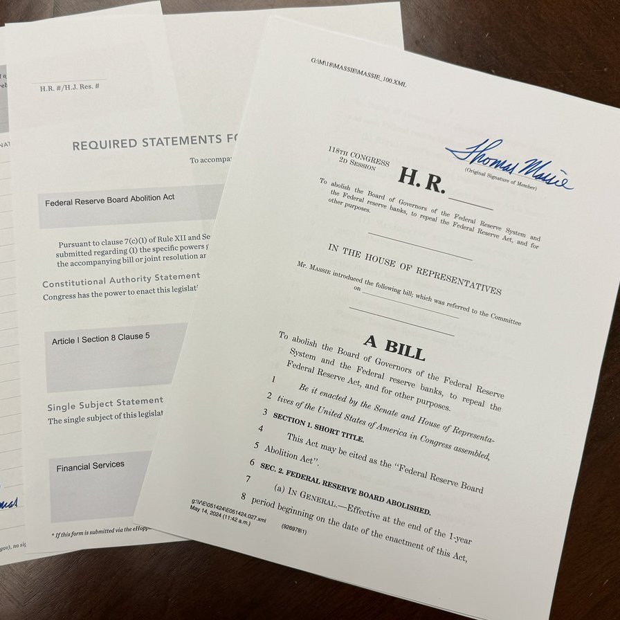 Introduced by Rep. Thomas Massie, this bill calls for the complete abolition of the Board of Governors and all Federal Reserve banks within a year.