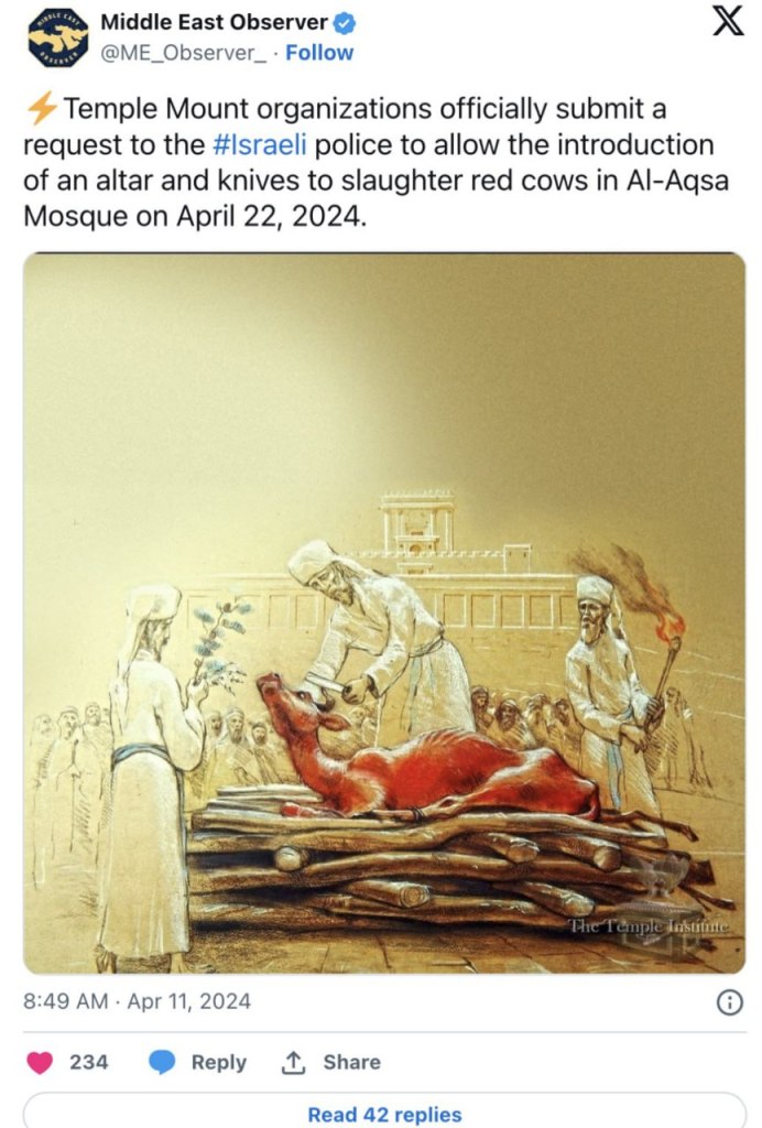 Temple Mount Organization submits formal request to conduct Red Heifer Sacrifice at Al-Aqsa Mosque in Jerusalem on April 22nd.