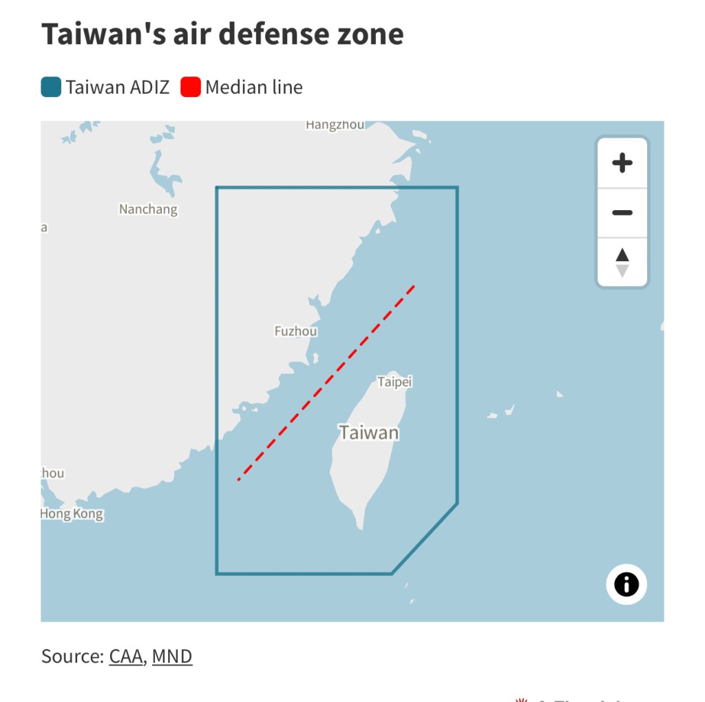 An ADIZ—also deployed by neighboring China, South Korea, Japan and the Philippines—is a self-declared buffer zone in international airspace used to identify foreign military and civilian aircraft. This week’s PLA air incursions were the first to reach double figures in February, after having done so on three occasions last month.