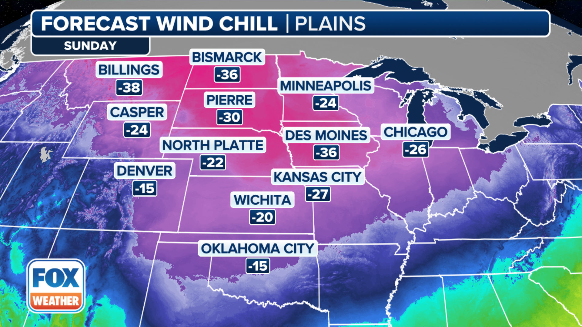 Chicago, for example, will see a wind chill value of about 26 degrees below zero by Sunday.