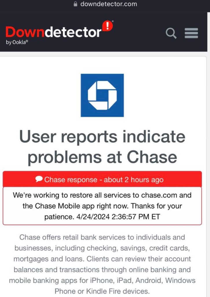 DownDetector, a website the monitors online issues, reported problems around 2pm ET – Chase has acknowledged the outage and is working to fix it.