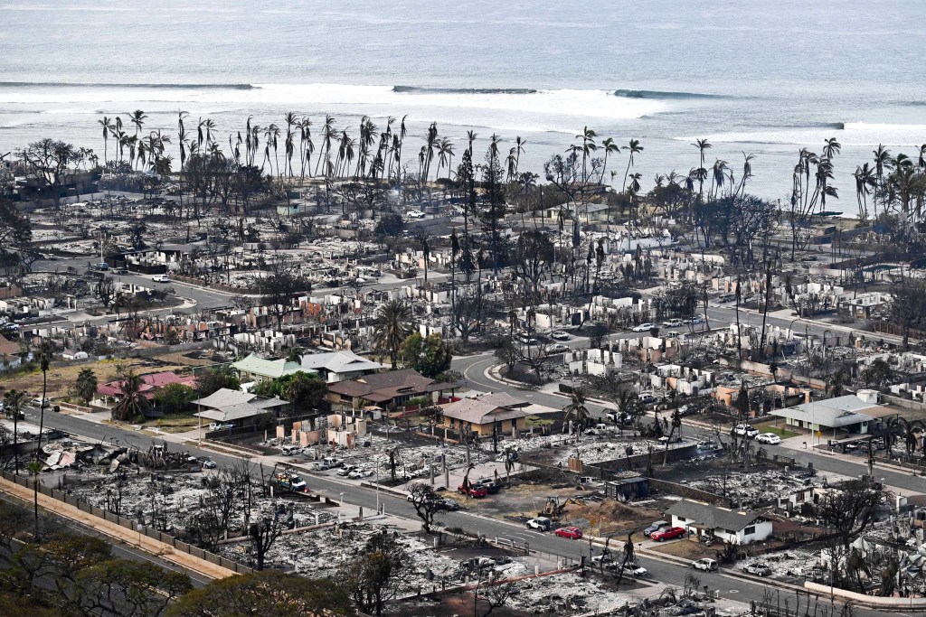 An aerial image taken on August 10, 2023 shows destroyed homes and buildings burned to the ground in Lahaina in the aftermath of wildfires in western Maui, Hawaii. At least 36 people have died after a fast-moving wildfire turned Lahaina to ashes, officials said August 9, 2023 as visitors asked to leave the island of Maui found themselves stranded at the airport. The fires began burning early August 8, scorching thousands of acres and putting homes, businesses and 35,000 lives at risk on Maui, the Hawaii Emergency Management Agency said in a statement. (Photo by Patrick T. Fallon / AFP) (Photo by PATRICK T. FALLON/AFP via Getty Images)