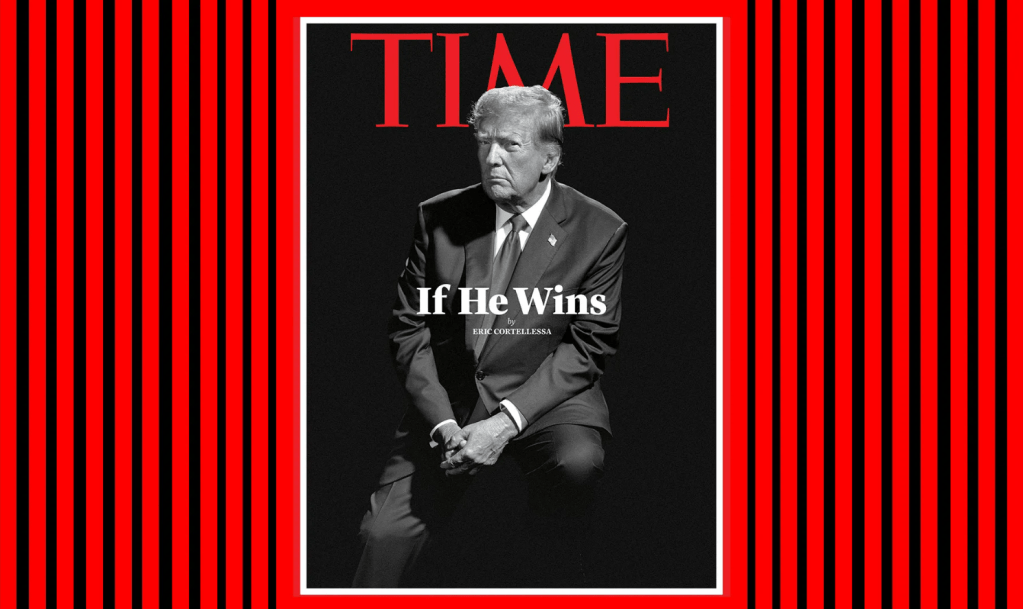 The former president’s interview will appear in TIME’s May 17 issue, which will include a cover with a black and white image of Trump sitting on a stool and scowling at the camera with, ‘If He Wins’ written in white across the cover.