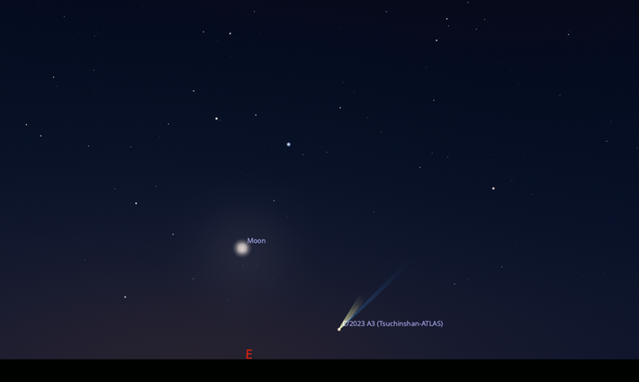 - Monday, Sept. 30: look east an hour before sunrise to see comet A3 shine to the lower-right of a 5%-lit waning crescent moon.
