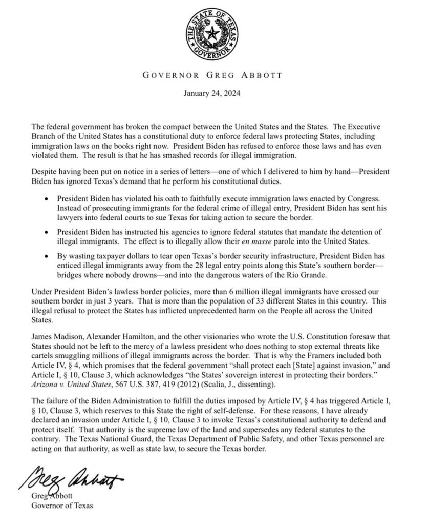 The formal, official groundwork is now laid for actual Civil War inside the United States. The Governor of Texas has declared, in writing, that the federal government has “broken the compact” with the states. He announced he has invoked the “Invasion” clause of the Constitution and says Texas has a right to self defense which it will enforce with the Texas National Guard.