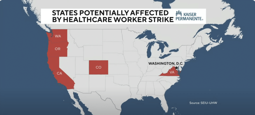 The Coalition of Kaiser Permanente Unions, representing about 85,000 of the health system’s employees nationally, approved a strike for three days in California, Colorado, Oregon, and Washington, and for one day in Virginia and Washington, D.C.